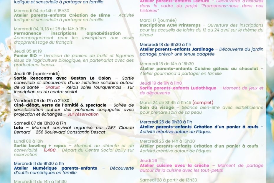 🌸 En mars au Centre Social Boilly Le printemps fait son grand retour et le Centre Social Boilly vous propose un mois riche en rencontres,… Lire la suite »Programmation du Centre Social Boilly – Mars 2026
