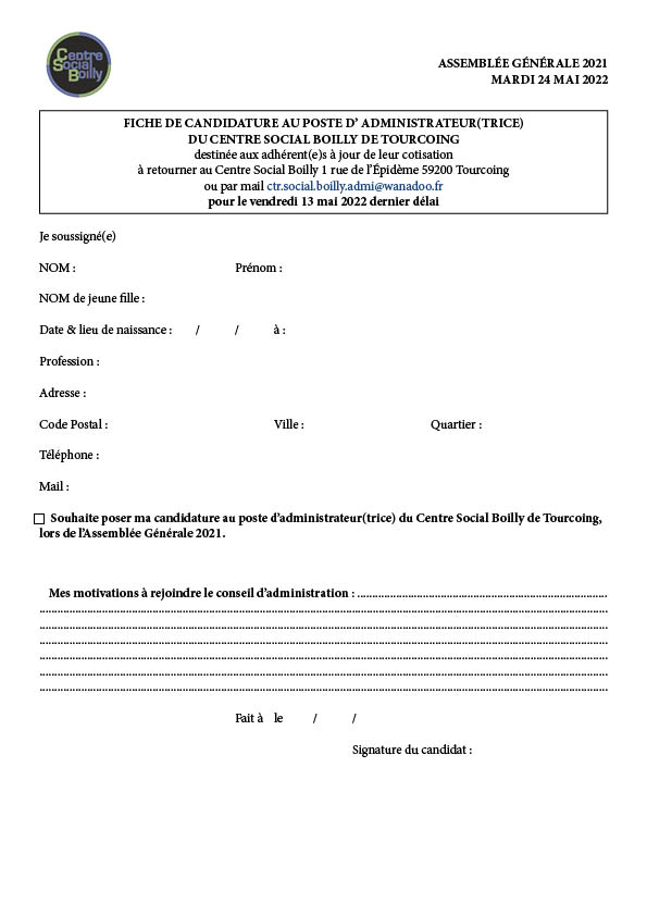 Assemblée Générale & Candidature Administrateur28/04/202209/05/2022Assemblée Générale, BOILLY Veuillez laisser ce champ videVotre E-mail * Vérifiez votre boite de réception ou votre répertoire d’indésirables pour confirmer votre abonnement. précédentBoilly Programmation AvrilsuivantBoilly Programmation Mai Laisser un commentaire Annuler la réponseVotre adresse e-mail ne sera pas publiée. Les champs obligatoires sont indiqués avec *Commentaire * Nom * E-mail * Site web Enregistrer mon nom, mon e-mail et mon site dans le navigateur pour mon prochain commentaire. Je veux m'abonner à la Newsletter.